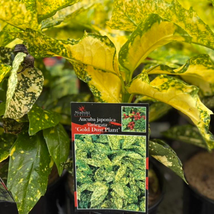Aucuba japonica variegata, also known as ‘Gold Dust Plant’, is a hardy, low-maintenance, shade-loving evergreen shrub with glossy green leaves splashed with golden speckles. In spring it produces delicate purple flowers, followed by vibrant red berries on female plants once pollinated, creating beautiful seasonal interest.