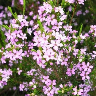 A smaller growing, rounded evergreen shrub, with heather-like, aromatic foliage. This hardy plant puts on quite a show as it is totally covered in tiny light pink star shaped flowers during late winter and spring. Grows 1m x 1m.