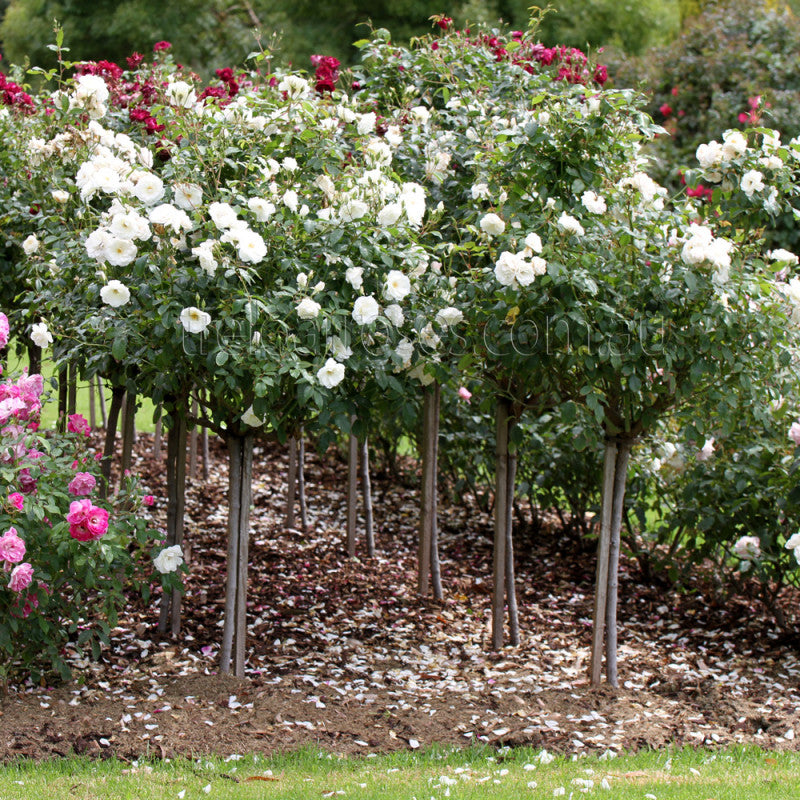 Standard Roses are a variation of the normal bush rose grafted at a height of 90cm or 60cm (Patio Standards). They can create a formal appearance if planted in a row or as a feature in garden beds or in large tubs. The head of the standard can vary in shape, Hybrid Teas will grow in a V shape, Floribundas in general keep to a rounder shape. David Austins can also vary with each variety. It is important to secure them to a sturdy stake