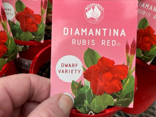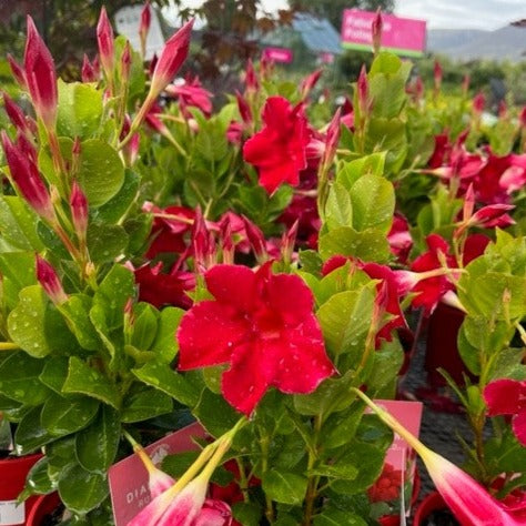 A delicate evergreen vine with symmetrical foliage. It will wrap around the nearest climbing structure and produce an abundance of wide flowers with a deep centre all summer long.